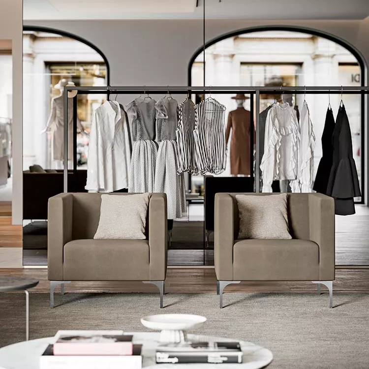 The embracing backrest and the high armrests favour the correct posture of the guests and clients in the waiting rooms, halls, ateliers and other reception facilities.