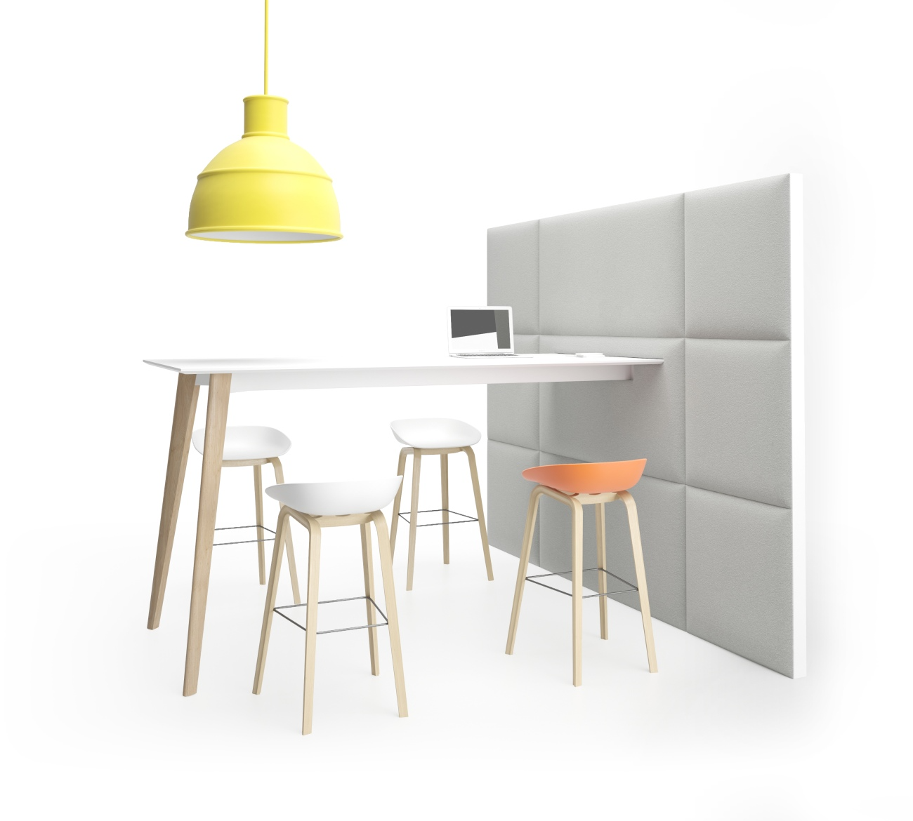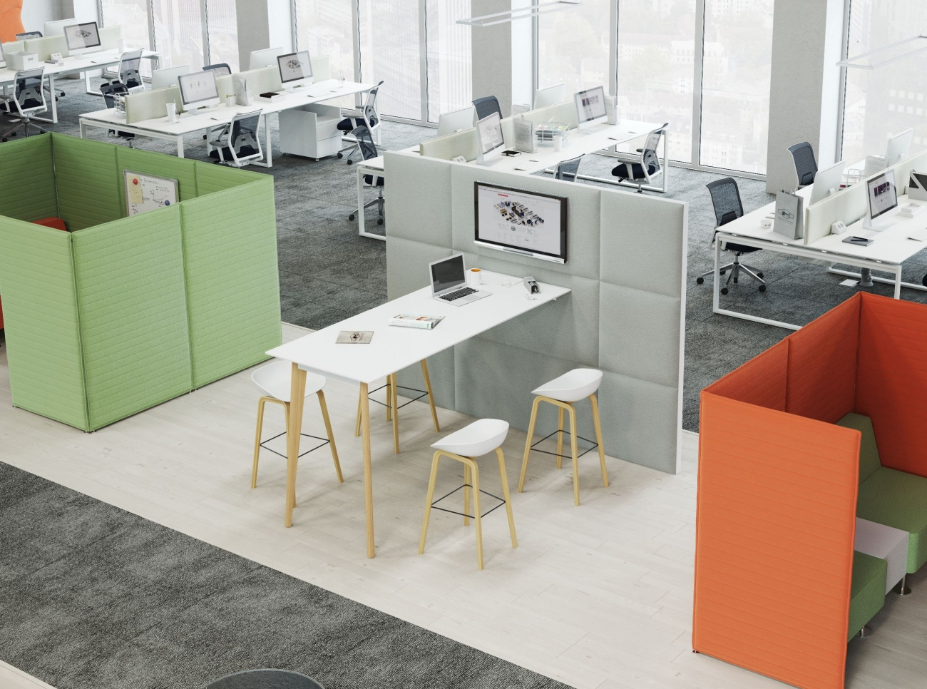 E-Wall is a multimedia furniture system for all types of meetings. A characteristic feature of E-Wall are its high tables for working in standing position or with bar stools. A TV can be mounted on the front wall above the table top. Cable management is convenient thanks to a channel built inside the construction. On the E-Wall’s back panel we can choose a creative whiteboard made of magnetic tempered, painted glass.