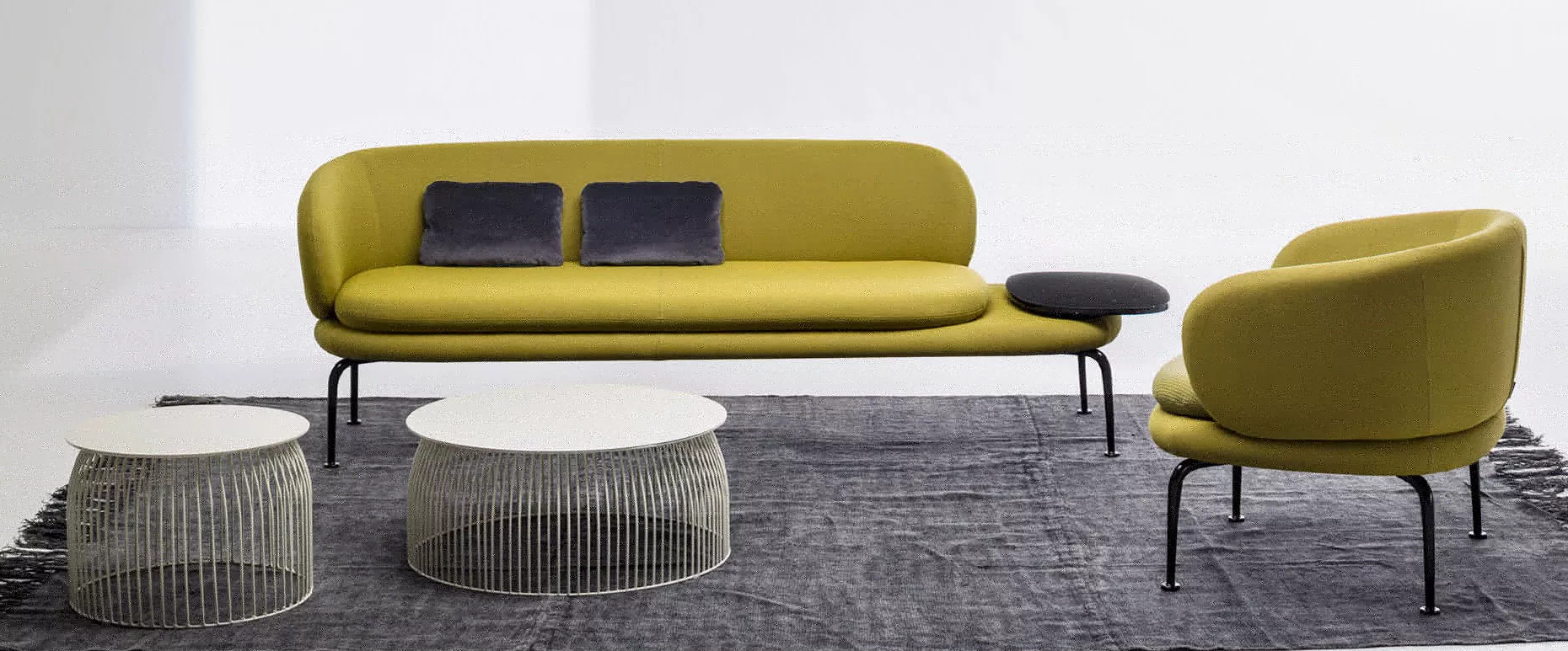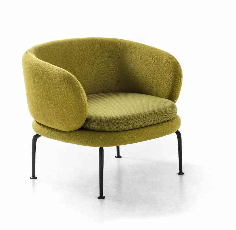 The rounded corners and the slender, simple metal legs give a soft, light feel to Soave, which has a consistently understated nature. When complemented by the small support table, it is perfect for all uses in the contract market and exhibition venues.